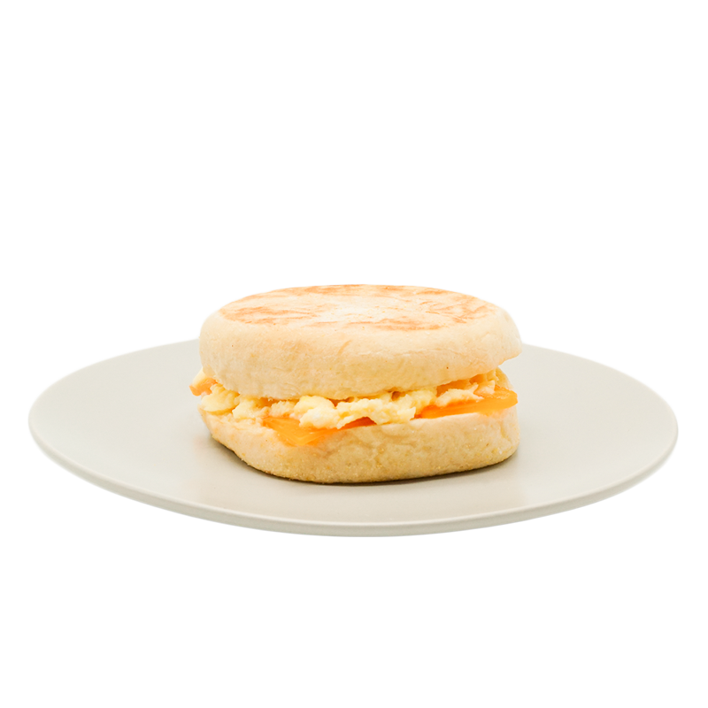 An all-day breakfast sandwich filled with cheddar cheese and fluffy scrambled egg.