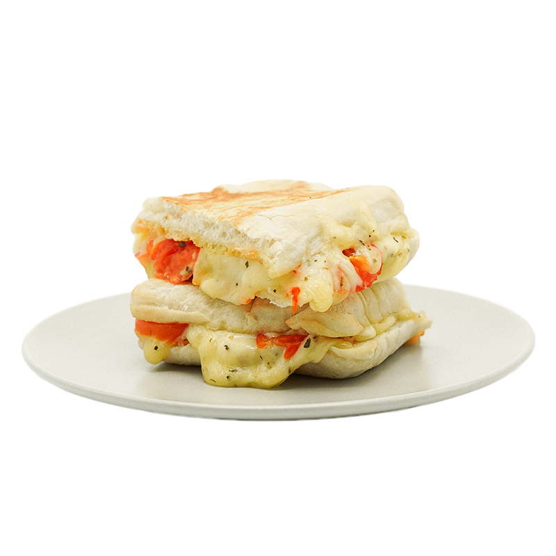 Juicy red tomato slices on melty mozzarella ciabatta–a sandwich that's deliciously healthy.