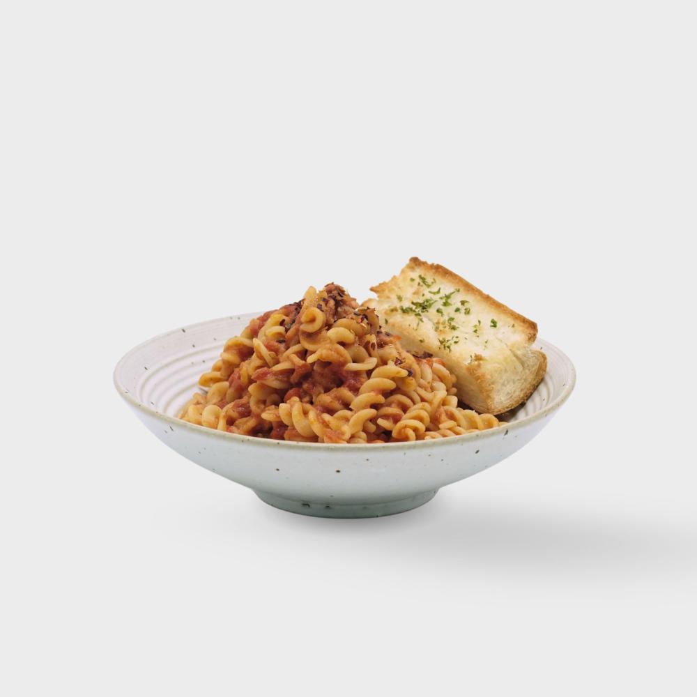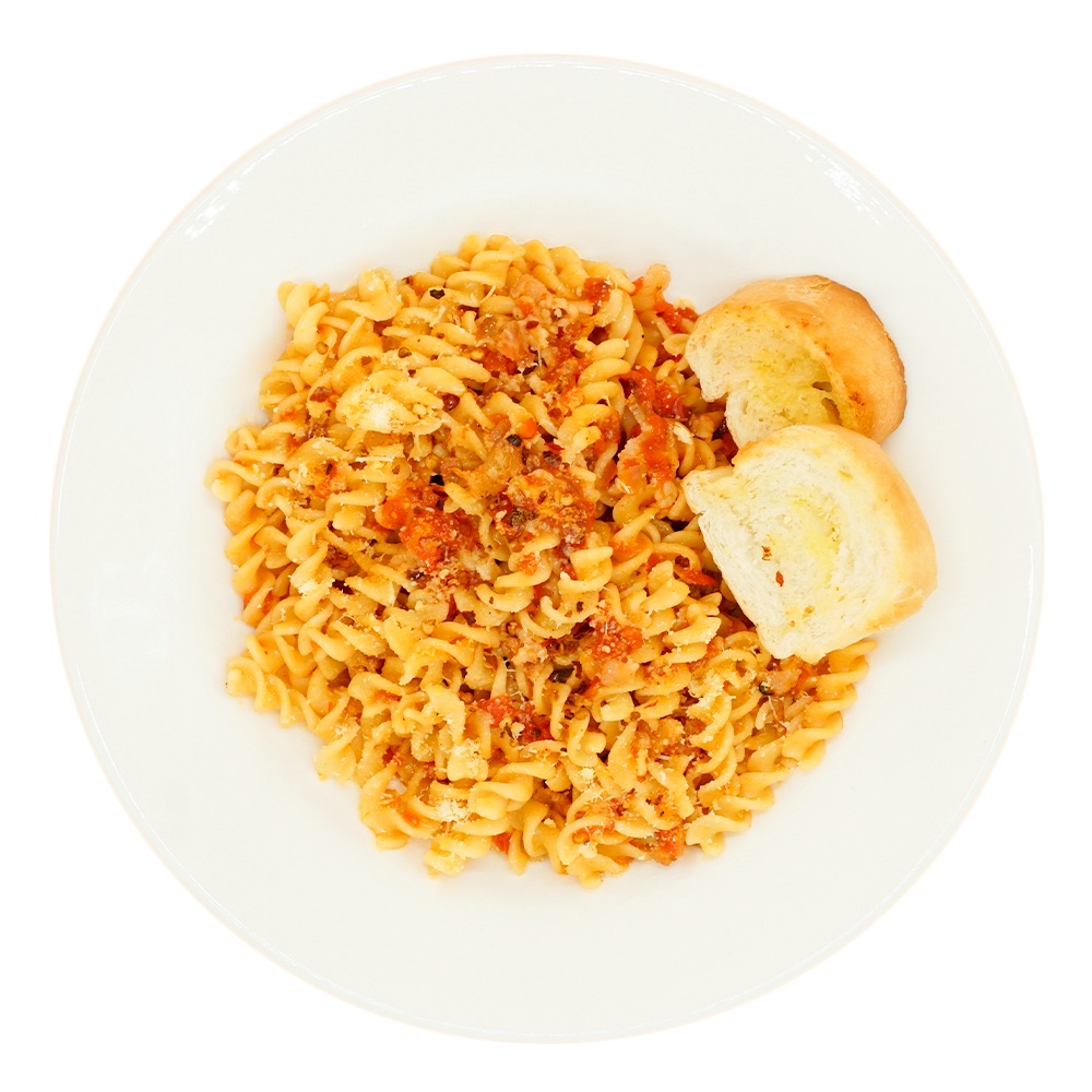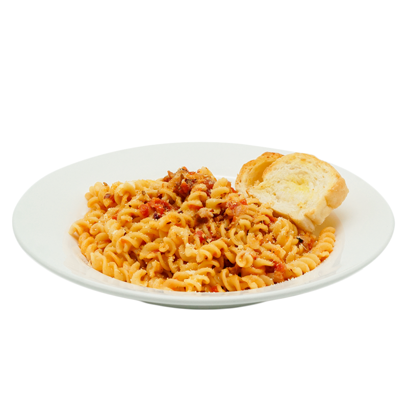 Our take on a traditional Italian pasta sauce, made with fresh tomatoes, red pepper flakes, bacon bits, white wine, and topped with parmesan cheese.